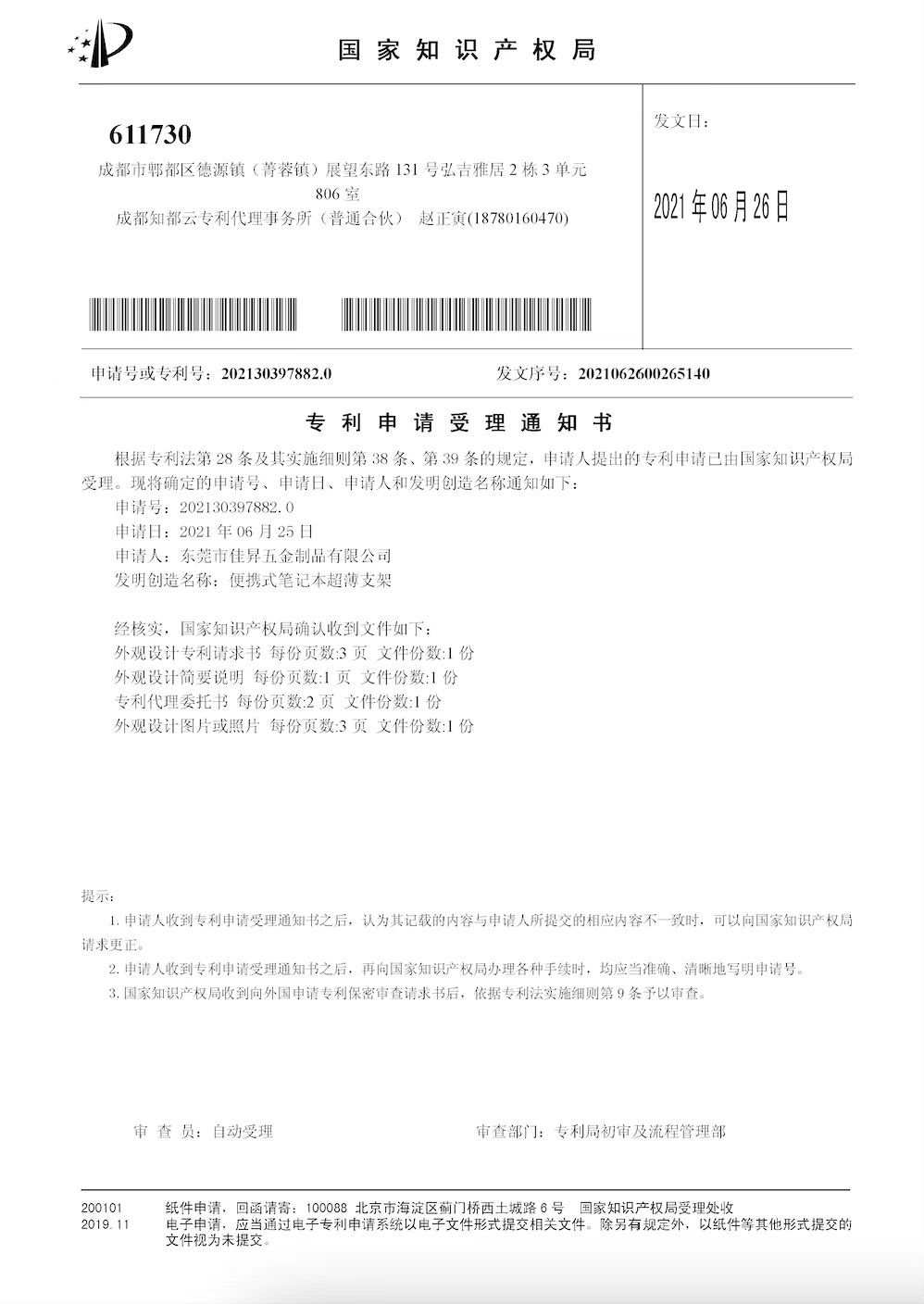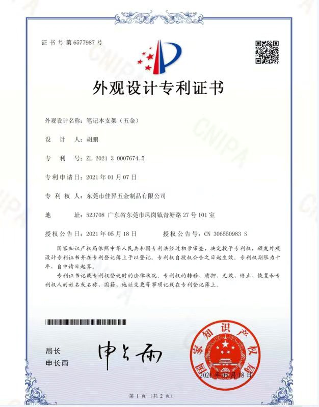 • 筆記本支架-五金專利證書(shū)